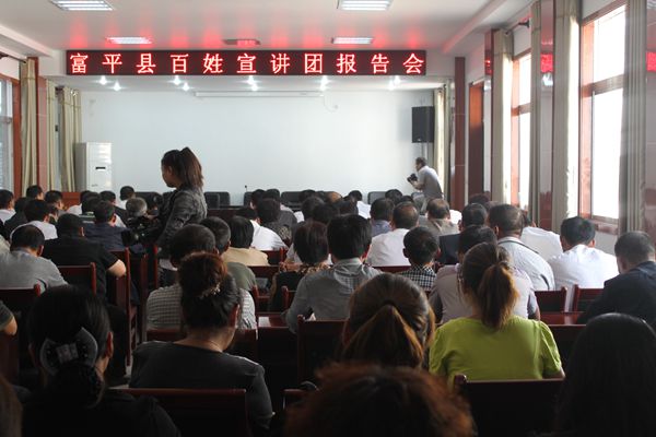 据悉,百姓宣讲团是富平县委紧密结合当前形势和干部群众思想实际,开展职业道德、岗位职责、纪律作风大排查大整顿活动的一项重要内容,是深入开展群众路线和中国梦宣传教育的一项实实在在的举措。由县委宣传部理论教育股牵头组织实施。一月来,已连续举办了多场宣讲报告会,旨在用身边的典型人物和典型事迹教育干部群众,增强广大干部爱岗敬业、服务群众、热爱富平、建设家乡的自觉意识,为富平发展汇聚正能量。
